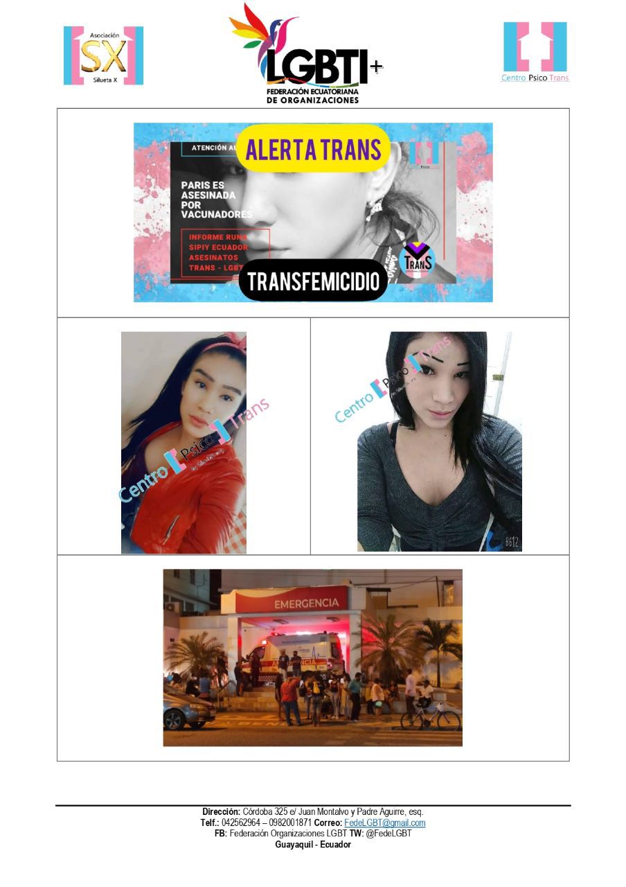 El Centro Psico Trans de Quito de la Asociación Silueta X, miembros de la Plataforma Nacional “Nueva Red Trans Ecuador” (que cubre con sus colectivas lo rural, comunitario y las periferias), el Observatorio GLBTI, y la Federación Nacional de Organizaciones LGBT, ponen en conocimiento público el siguiente hecho.