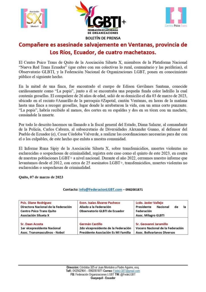 El Centro Psico Trans de Quito de la Asociación Silueta X, miembros de la Plataforma Nacional “Nueva Red Trans Ecuador” (que cubre con sus colectivas lo rural, comunitario y las periferias), el Observatorio GLBTI, y la Federación Nacional de Organizaciones LGBT, ponen en conocimiento público el siguiente hecho.