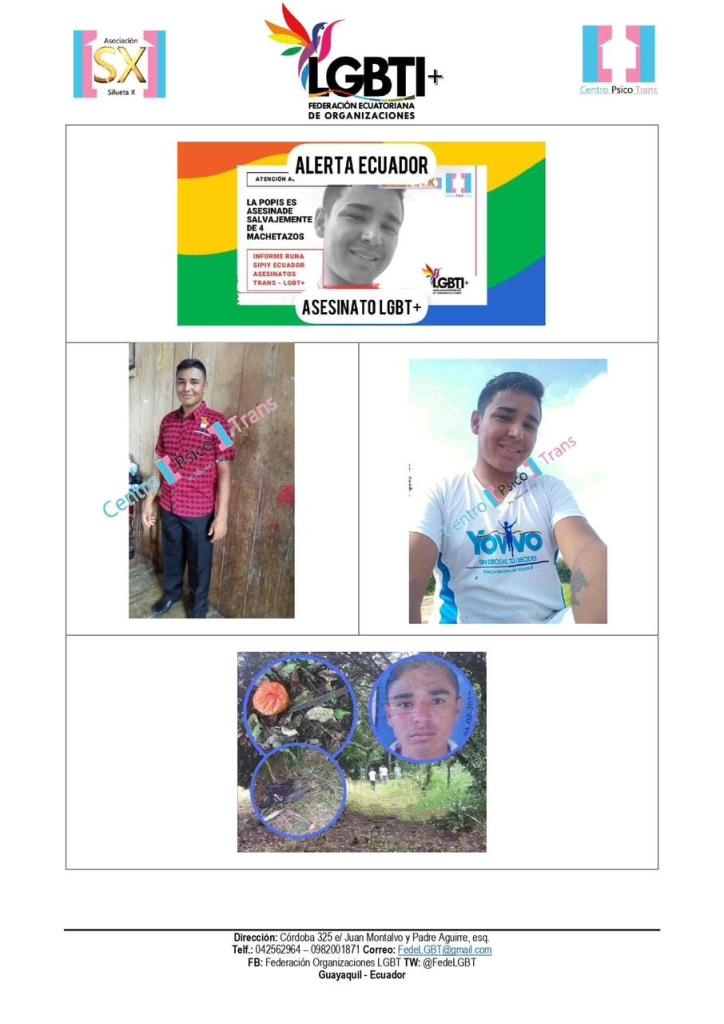 Por todo lo descrito hacemos un llamado a la fiscal general del Estado, Diana Salazar, al comandante de la Policía, Carlos Cabrera, al subsecretario de Diversidades Alexander Guano, al defensor del Pueblo de Ecuador (e), Cesar Córdoba Valverde, a realizar las coordinaciones necesarias para dar con el o los culpables, de este hecho que enluta a nuestra comunidad.