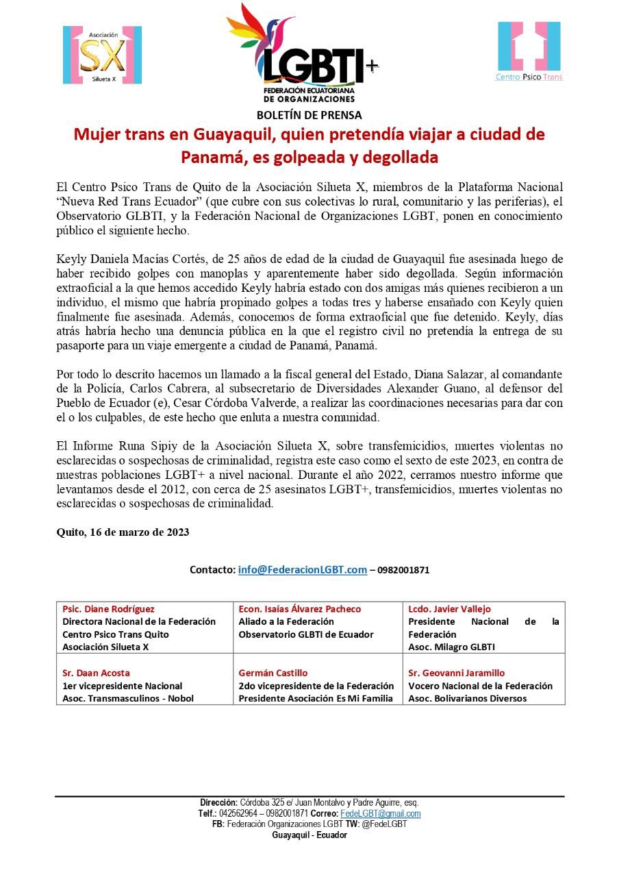 Por todo lo descrito hacemos un llamado a la fiscal general del Estado, Diana Salazar, al comandante de la Policía, Carlos Cabrera, al subsecretario de Diversidades Alexander Guano, al defensor del Pueblo de Ecuador (e), Cesar Córdoba Valverde, a realizar las coordinaciones necesarias para dar con el o los culpables, de este hecho que enluta a nuestra comunidad.