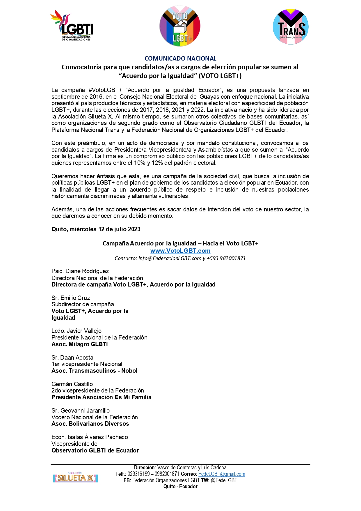 Con este preámbulo, en un acto de democracia y por mandato constitucional, convocamos a los candidatos a cargos de Presidente/a Vicepresidente/a y Asambleístas a que se sumen al “Acuerdo por la Igualdad”. La firma es un compromiso público con las poblaciones LGBT+ de lo candidatos/as quienes representamos entre el 10% y 12% del padrón electoral.