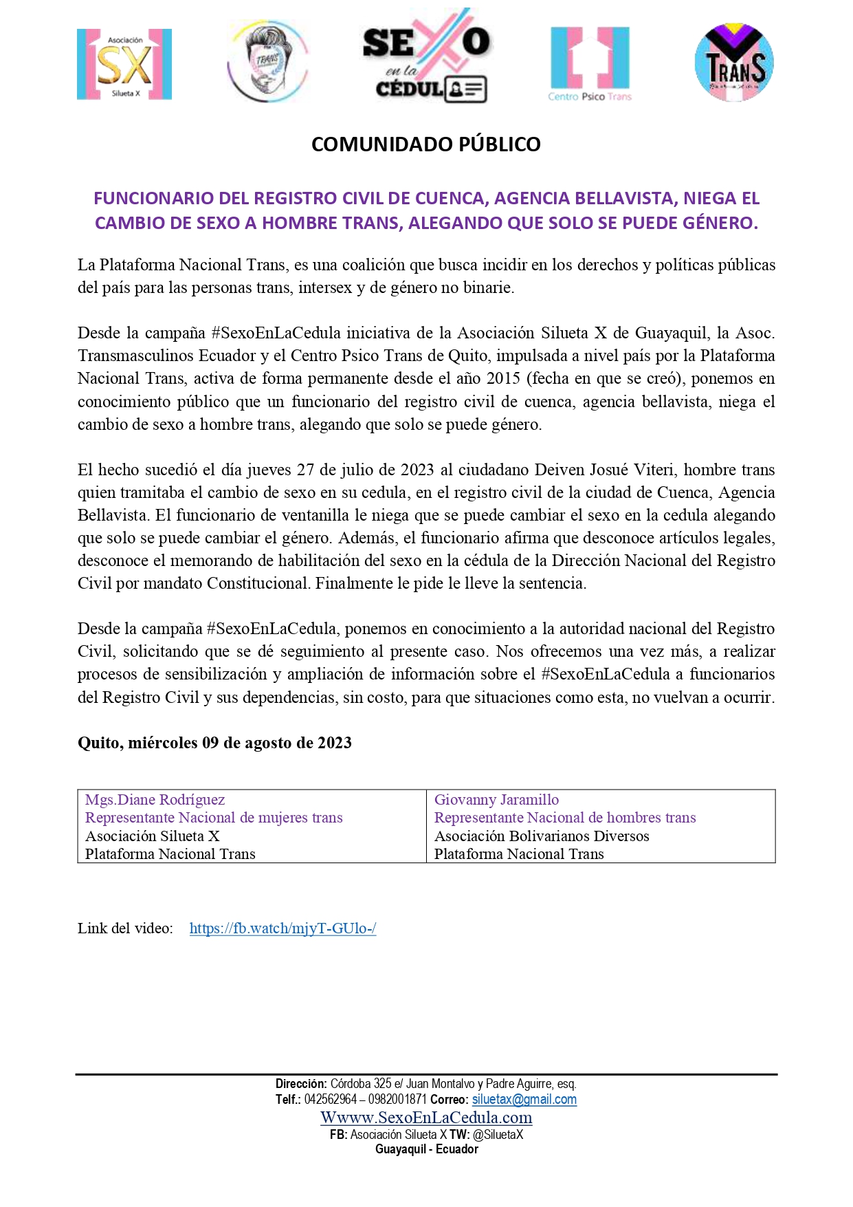 Desde la campaña #SexoEnLaCedula iniciativa de la Asociación Silueta X de Guayaquil, la Asoc. Transmasculinos Ecuador y el Centro Psico Trans de Quito, impulsada a nivel país por la Plataforma Nacional Trans, activa de forma permanente desde el año 2015 (fecha en que se creó), ponemos en conocimiento público que un funcionario del registro civil de cuenca, agencia bellavista, niega el cambio de sexo a hombre trans, alegando que solo se puede género.