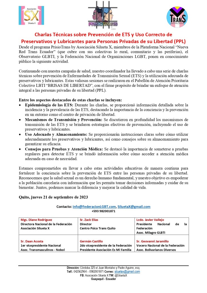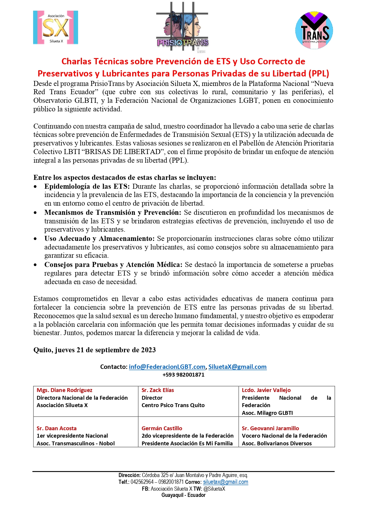 Desde el programa PrisioTrans by Asociación Silueta X, miembros de la Plataforma Nacional “Nueva Red Trans Ecuador” (que cubre con sus colectivas lo rural, comunitario y las periferias), el Observatorio GLBTI, y la Federación Nacional de Organizaciones LGBT, ponen en conocimiento público la siguiente actividad.