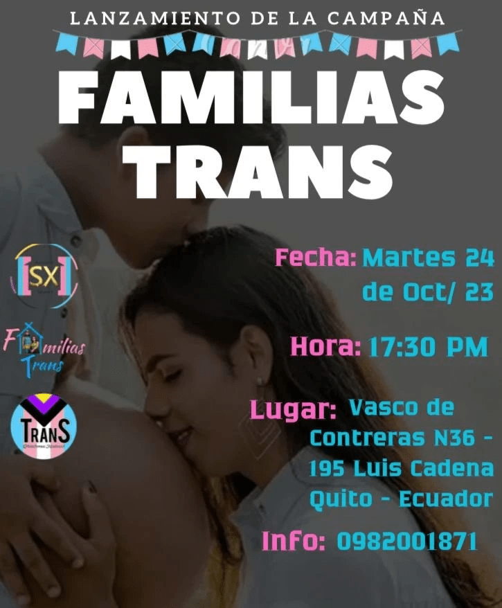 #QuitoLGBT + Lanzamiento de la Campaña #FamiliasTrans Fecha: Martes, 24 de Octubre 2023 Hora: 17:30pm Lugar: Vasco de Contreras N36-195 y Luis Cadena a 100 Mts. De la Villalengua, Quito, Ecuador Informes: 0982001871 Más información en http:// FamiliasTrans.org