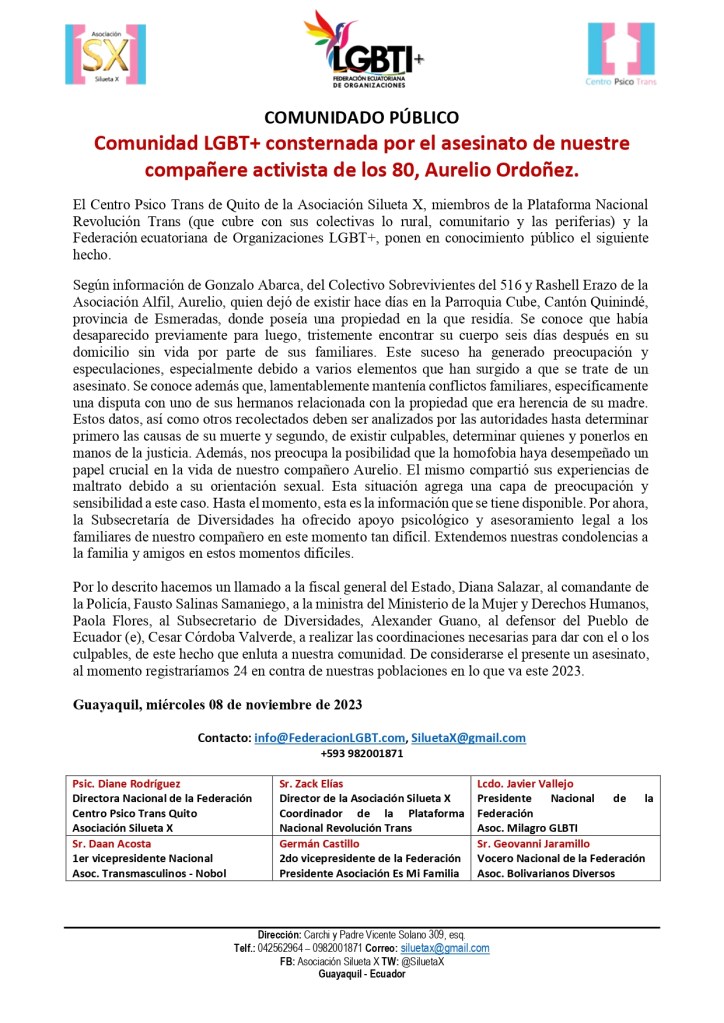 Por lo descrito hacemos un llamado a la fiscal general del Estado, Diana Salazar, al comandante de la Policía, Fausto Salinas Samaniego, a la ministra del Ministerio de la Mujer y Derechos Humanos, Paola Flores, al Subsecretario de Diversidades, Alexander Guano, al defensor del Pueblo de Ecuador (e), Cesar Córdoba Valverde, a realizar las coordinaciones necesarias para dar con el o los culpables, de este hecho que enluta a nuestra comunidad. De considerarse el presente un asesinato, al momento registraríamos 24 en contra de nuestras poblaciones en lo que va este 2023.