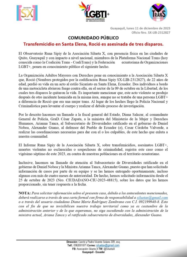 El Observatorio Runa Sipiy de la Asociación Silueta X, con presencia física en las ciudades de Quito, Guayaquil y con impacto a nivel nacional, miembros de la Plataforma Nacional Trans (hoy conocida como la Coalición Trans – CoaliTrans) y la Federación ecuatoriana de Organizaciones LGBT+, ponen en conocimiento público el siguiente hecho.