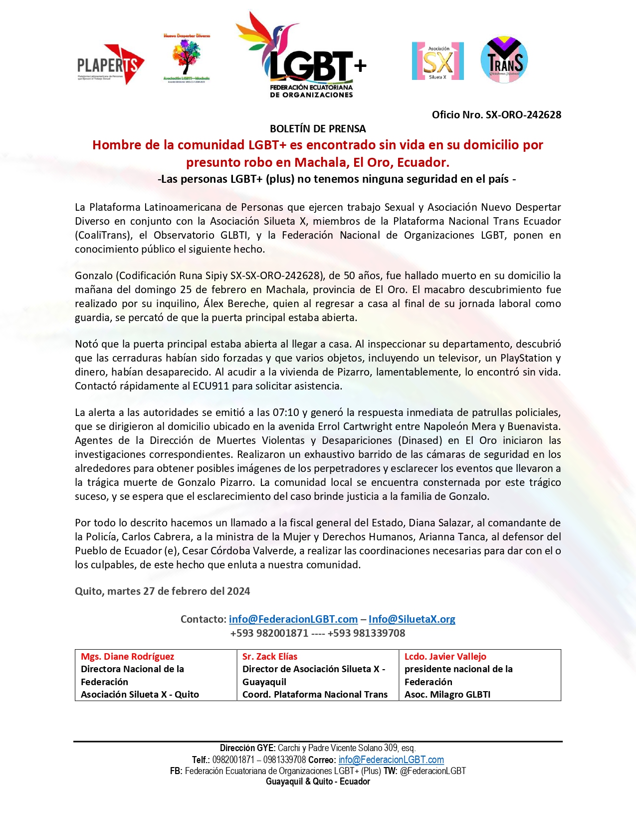 La Plataforma Latinoamericana de Personas que ejercen trabajo Sexual y Asociación Nuevo Despertar Diverso en conjunto con la Asociación Silueta X, miembros de la Plataforma Nacional Trans Ecuador (CoaliTrans), el Observatorio GLBTI, y la Federación Nacional de Organizaciones LGBT, ponen en conocimiento público el siguiente hecho.