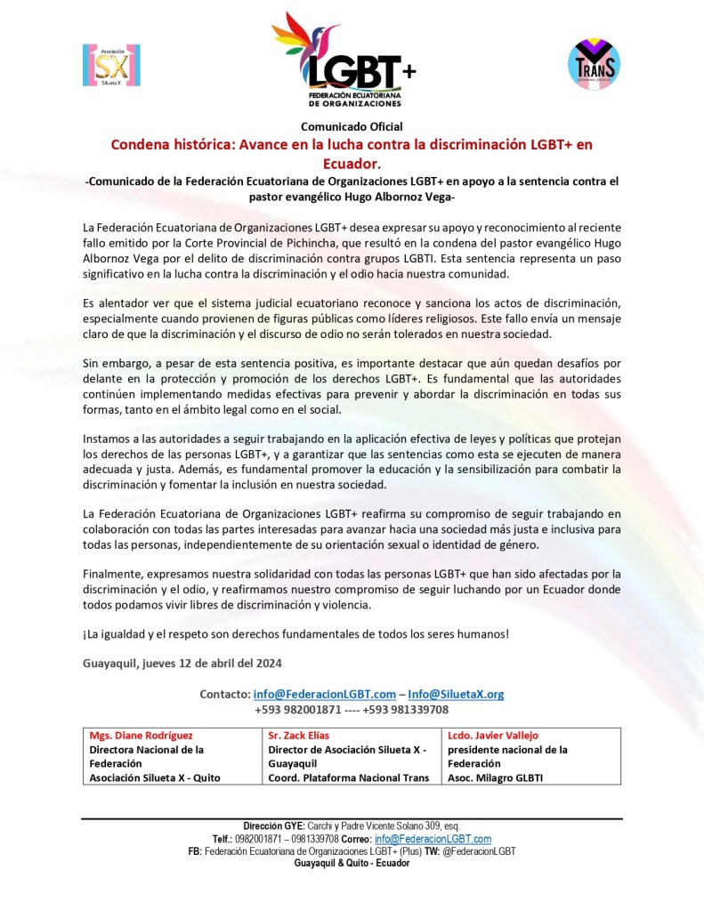 La Federación Ecuatoriana de Organizaciones LGBT+ desea expresar su apoyo y reconocimiento al reciente fallo emitido por la Corte Provincial de Pichincha, que resultó en la condena del pastor evangélico Hugo Albornoz Vega por el delito de discriminación contra grupos LGBTI. Esta sentencia representa un paso significativo en la lucha contra la discriminación y el odio hacia nuestra comunidad.