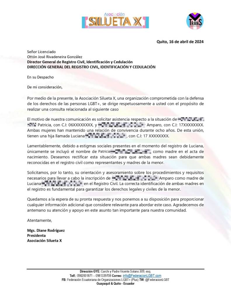 El motivo de nuestra comunicación es solicitar asistencia respecto a la situación de Patricia, con C.I: 06XXXXXXXX, y Amparo, con C.I: 17XXXXXXXX. Ambas mujeres han mantenido una relación de convivencia durante ocho años. De esta unión, tienen una hija llamada Luciana Isabella Vera Calderón, con C.I: 17 XXXXXXXX.