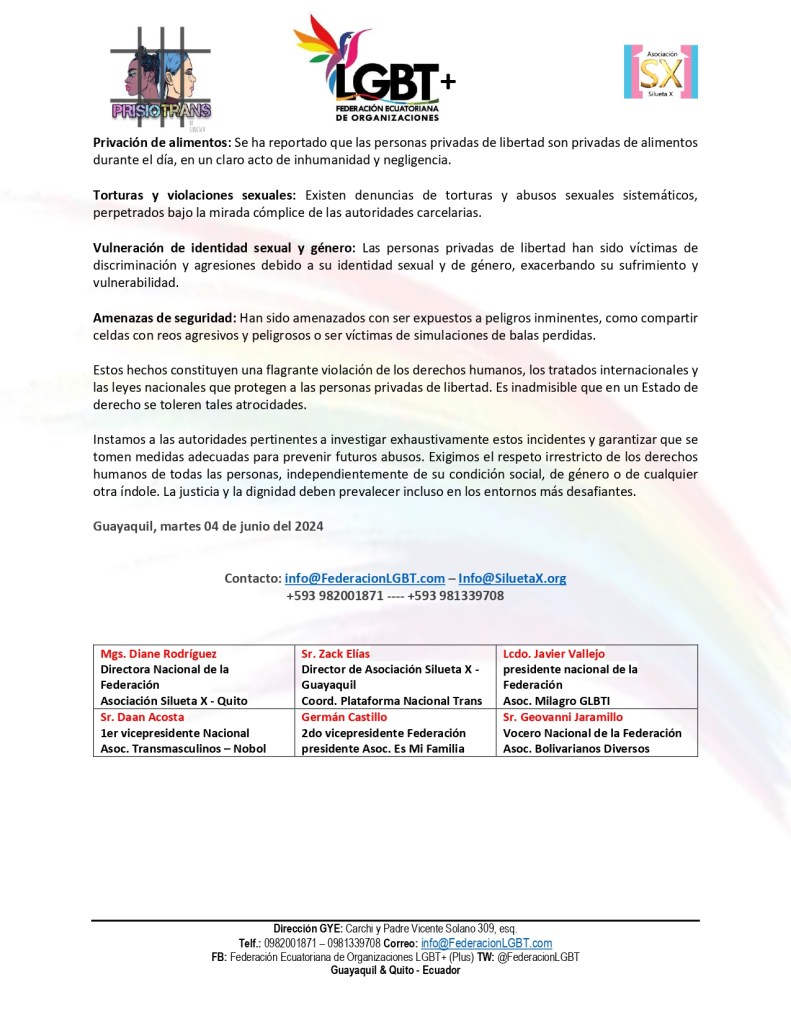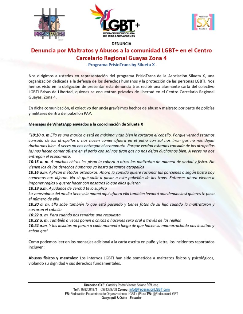 Nos dirigimos a ustedes en representación del programa PrisioTrans de la Asociación Silueta X, una organización dedicada a la defensa de los derechos humanos y la protección de las personas LGBTI. Nos hemos visto en la obligación de presentar esta denuncia tras recibir una alarmante carta del colectivo LGBTI Brisas de Libertad, quienes se encuentran privados de libertad en el Centro Carcelario Regional Guayas, Zona 4.
