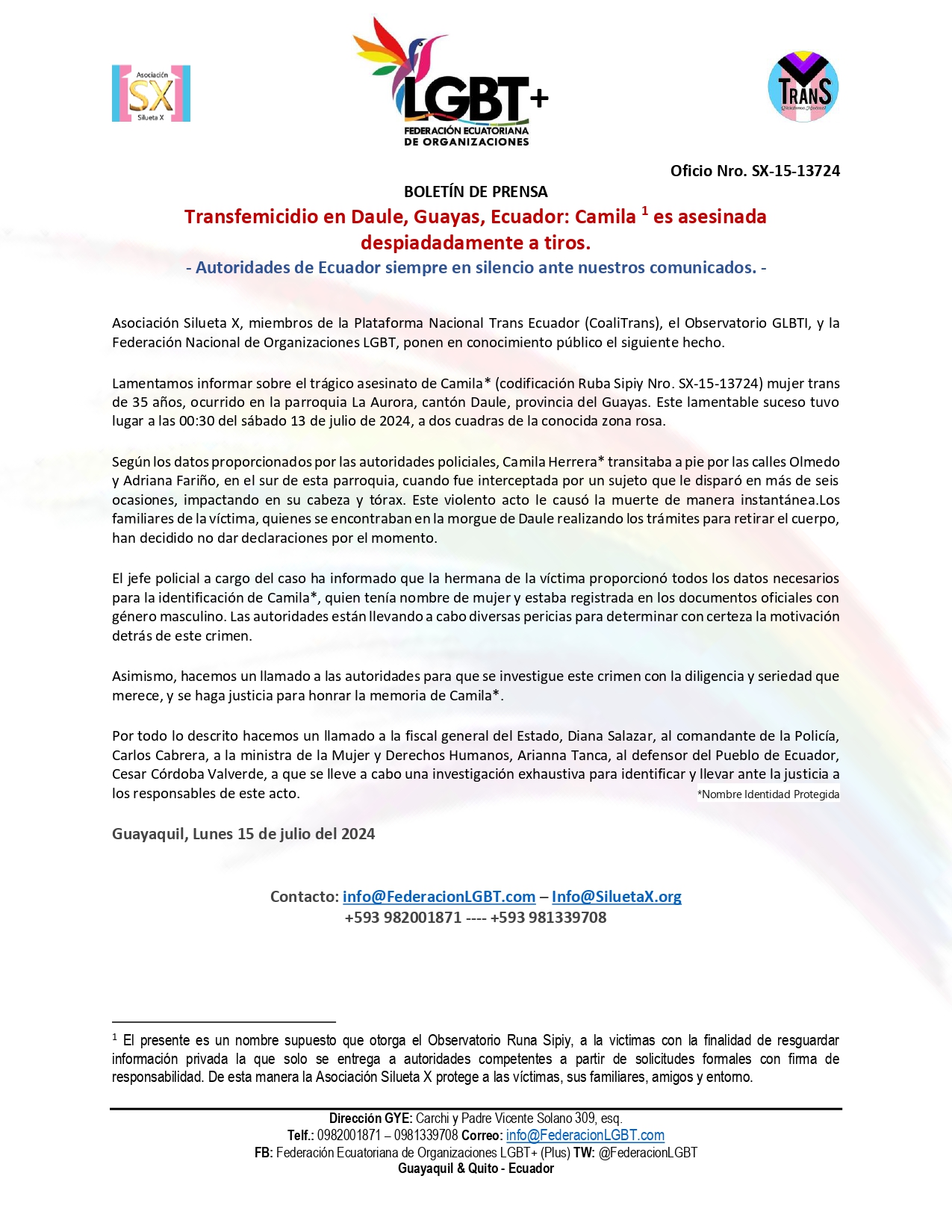 Lamentamos informar sobre el trágico asesinato de Camila (codificación Ruba Sipiy Nro. SX-15-13724) mujer trans de 35 años, ocurrido en la parroquia La Aurora, cantón Daule, provincia del Guayas. Este lamentable suceso tuvo lugar a las 00:30 del sábado 13 de julio de 2024, a dos cuadras de la conocida zona rosa.
