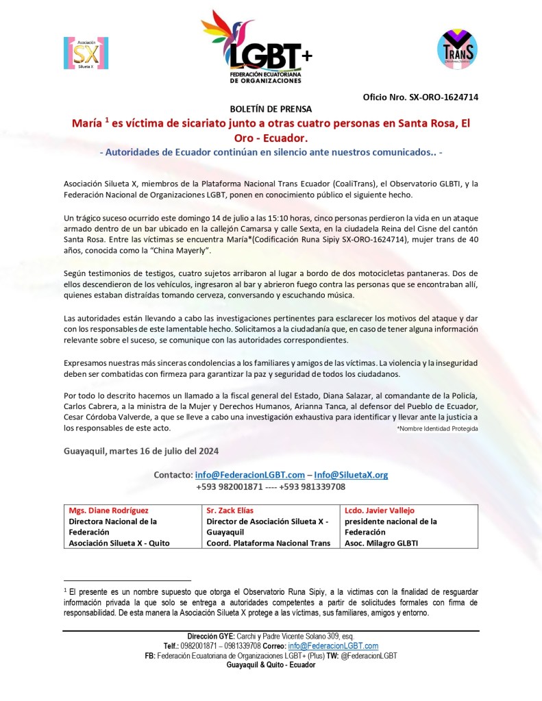 Asociación Silueta X, miembros de la Plataforma Nacional Trans Ecuador (CoaliTrans), el Observatorio GLBTI, y la Federación Nacional de Organizaciones LGBT, ponen en conocimiento público el siguiente hecho.