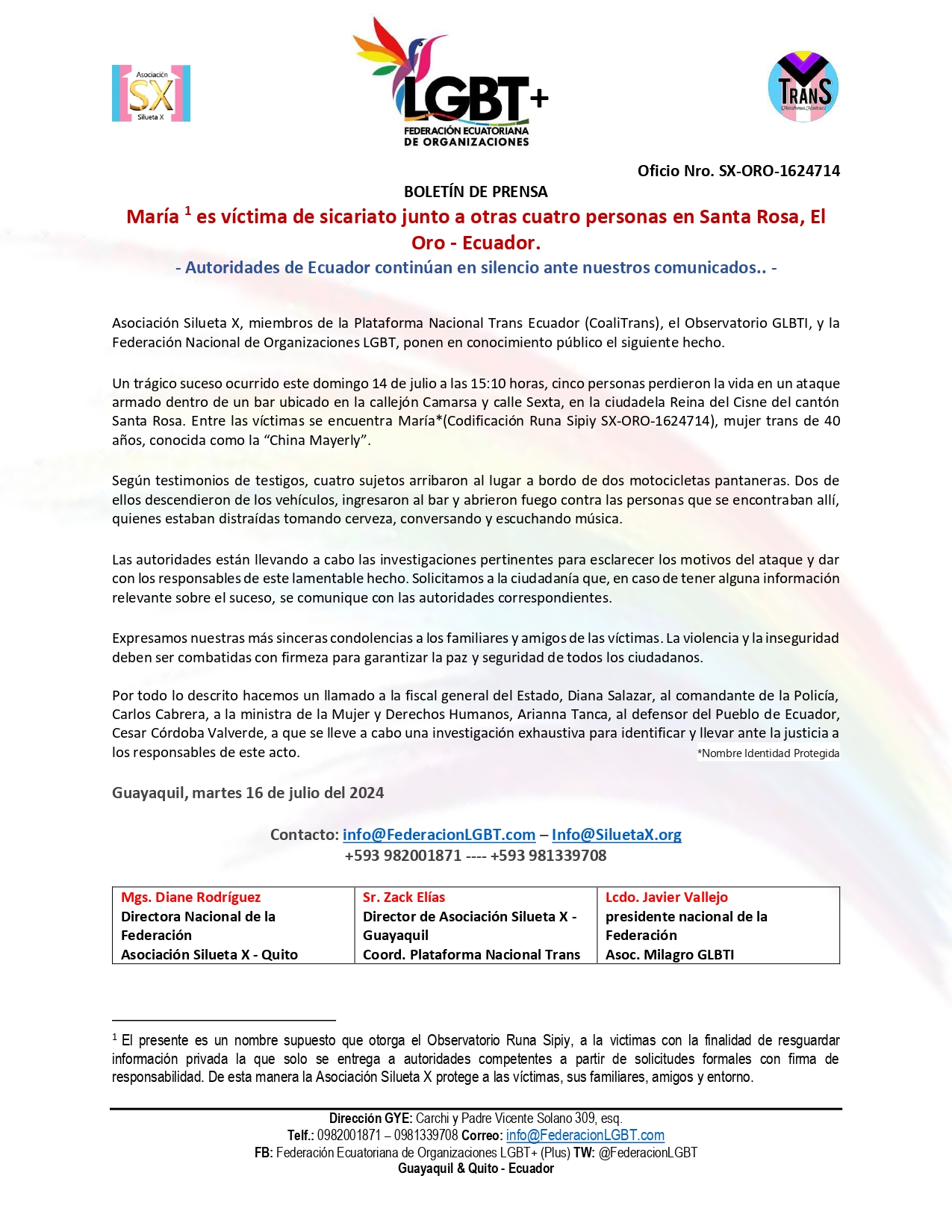 Asociación Silueta X, miembros de la Plataforma Nacional Trans Ecuador (CoaliTrans), el Observatorio GLBTI, y la Federación Nacional de Organizaciones LGBT, ponen en conocimiento público el siguiente hecho.