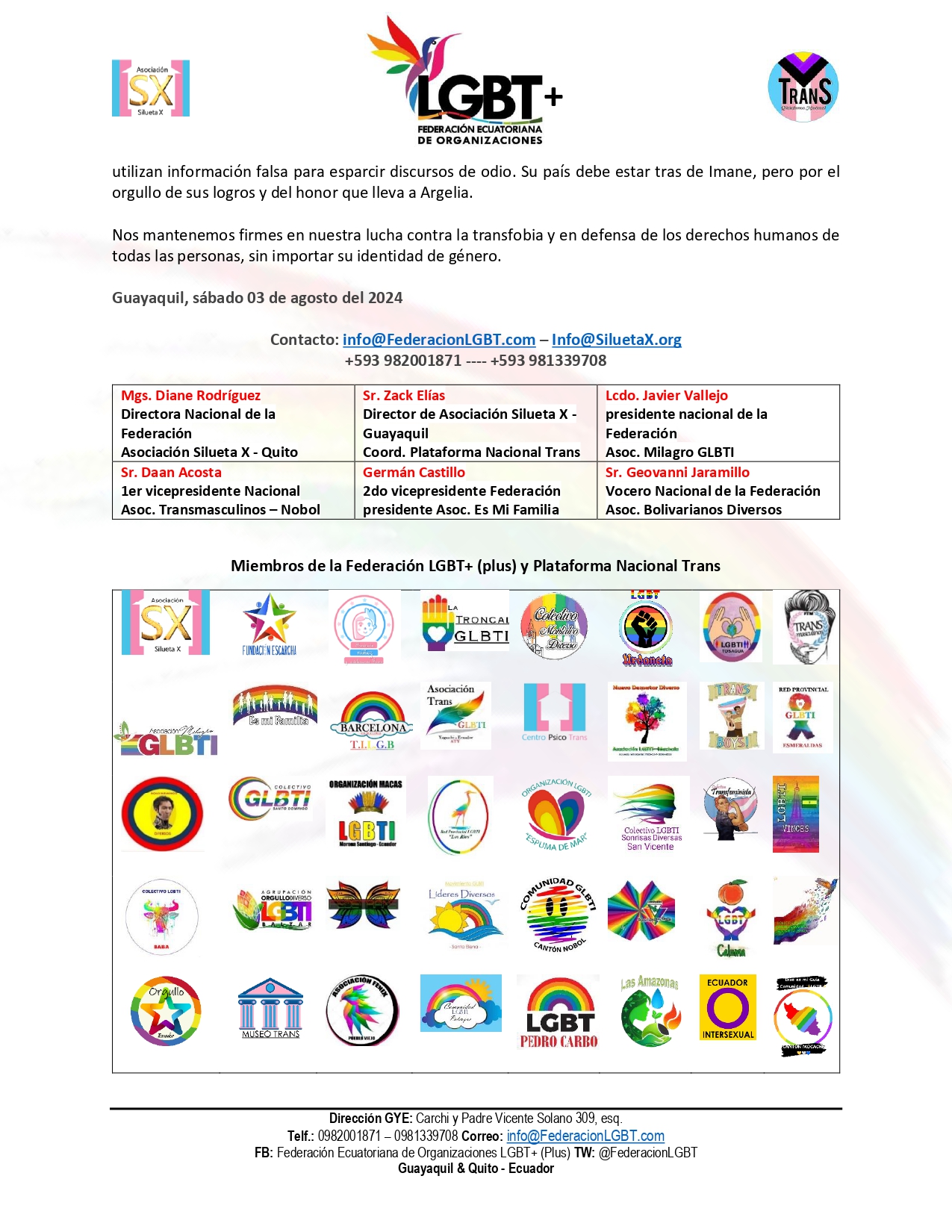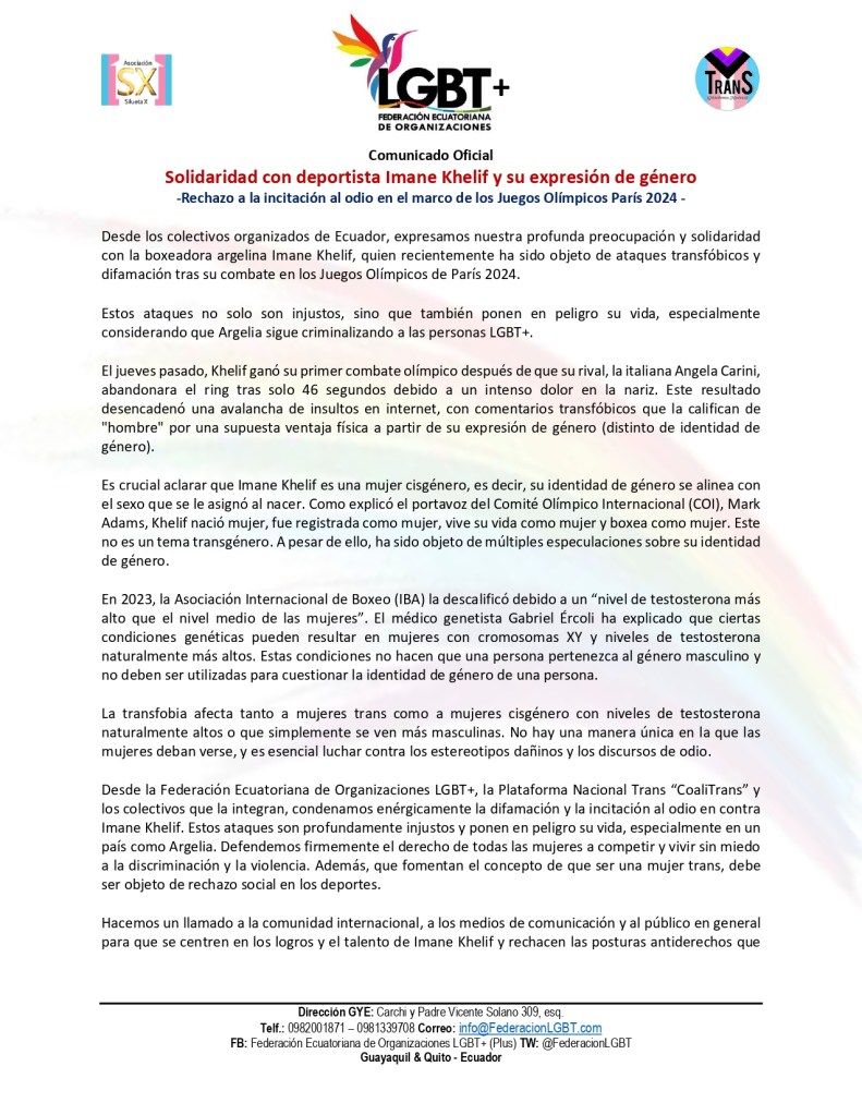 Desde la Federación Ecuatoriana de Organizaciones LGBT+, la Plataforma Nacional Trans “CoaliTrans” y los colectivos que la integran, condenamos enérgicamente la difamación y la incitación al odio en contra Imane Khelif. Estos ataques son profundamente injustos y ponen en peligro su vida, especialmente en un país como Argelia. Defendemos firmemente el derecho de todas las mujeres a competir y vivir sin miedo a la discriminación y la violencia. Además, que fomentan el concepto de que ser una mujer trans, debe ser objeto de rechazo social en los deportes.