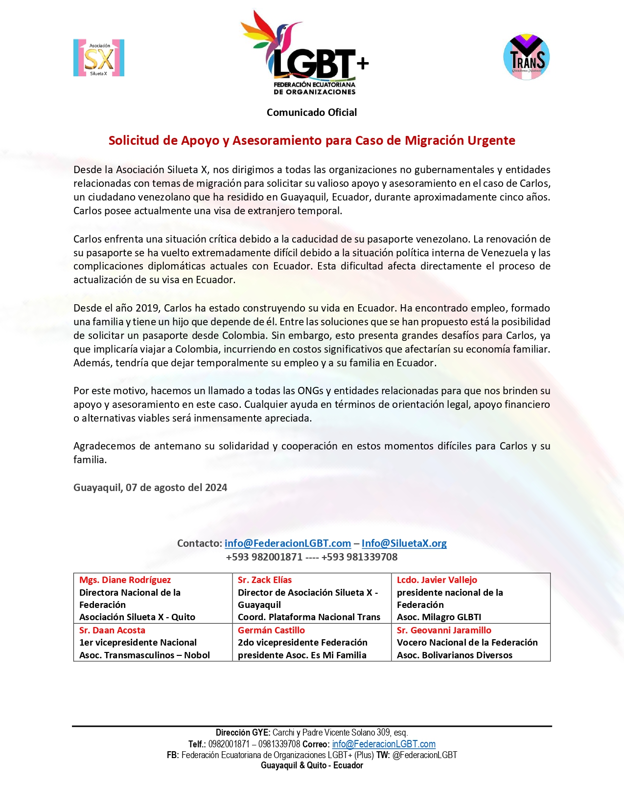 Desde la Asociación Silueta X, nos dirigimos a todas las organizaciones no gubernamentales y entidades relacionadas con temas de migración para solicitar su valioso apoyo y asesoramiento en el caso de Carlos, un ciudadano venezolano que ha residido en Guayaquil, Ecuador, durante aproximadamente cinco años. Carlos posee actualmente una visa de extranjero temporal.