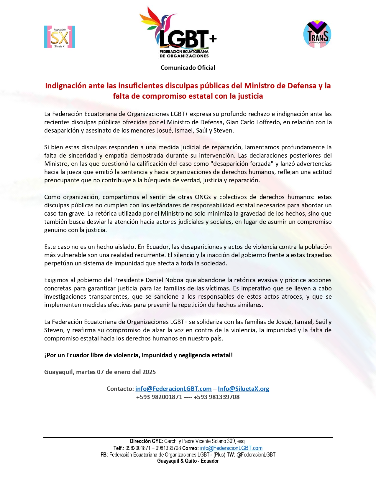 La Federación Ecuatoriana de Organizaciones LGBT+ expresa su profundo rechazo e indignación ante las recientes disculpas públicas ofrecidas por el Ministro de Defensa, Gian Carlo Loffredo, en relación con la desaparición y asesinato de los menores Josué, Ismael, Saúl y Steven.