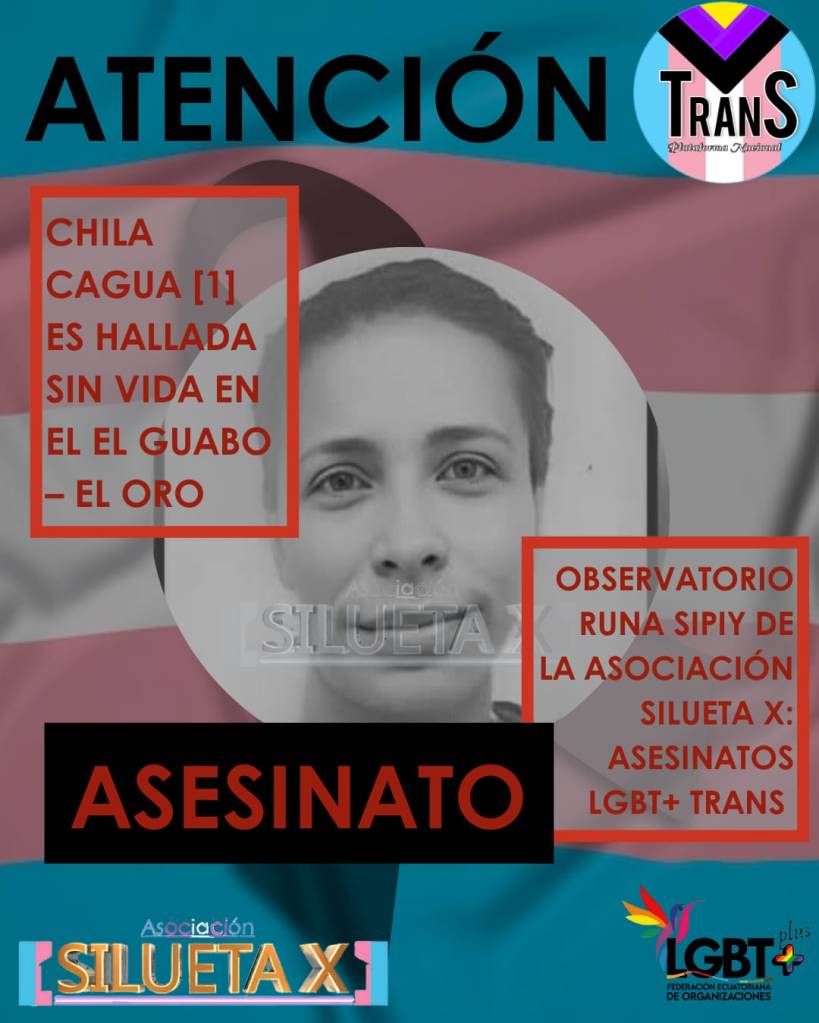La Federación Nacional de Organizaciones LGBT, Asociación Silueta X, miembros de la Plataforma Nacional Trans Ecuador (CoaliTrans), y el Observatorio GLBTI ponen en conocimiento público el siguiente hecho. El pasado lunes 27 de enero, alrededor de las 17:00, agricultores del sector El Recuerdo, en la vía a La Envidia, parroquia Barbones, cantón El Guabo, provincia de El Oro, encontraron el cadáver de una persona en un canal de riego. Tras alertar a las autoridades, agentes de la Policía Nacional confirmaron que se trataba de una persona transgénero, identificada posteriormente como Chila Cagua* (codificación Runa Sipiy SX ORO-250127),de 34 años.