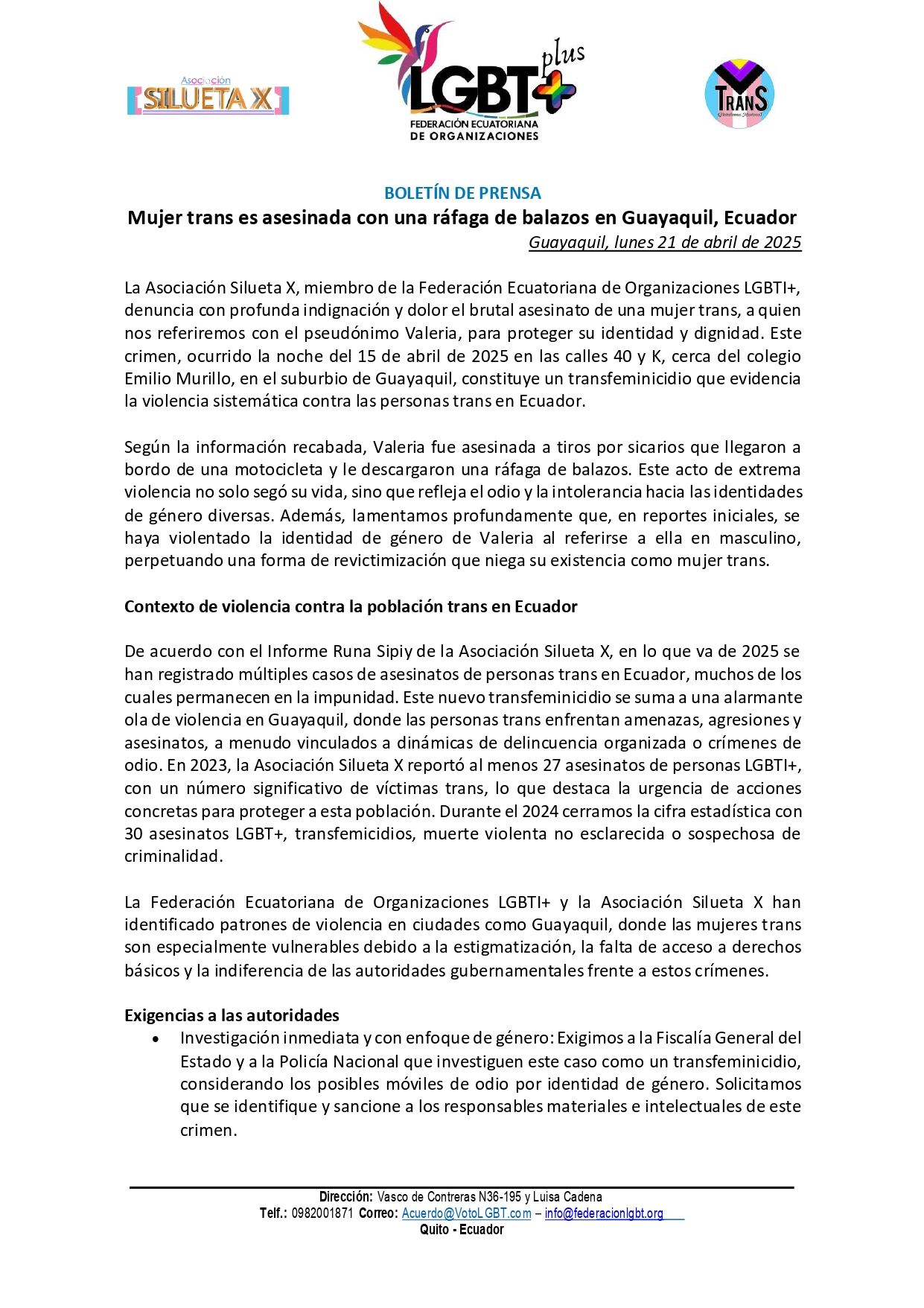 La Asociación Silueta X, miembro de la Federación Ecuatoriana de Organizaciones LGBTI+, denuncia con profunda indignación y dolor el brutal asesinato de una mujer trans, a quien nos referiremos con el pseudónimo Valeria, para proteger su identidad y dignidad. Este crimen, ocurrido la noche del 15 de abril de 2025 en las calles 40 y K, cerca del colegio Emilio Murillo, en el suburbio de Guayaquil, constituye un transfeminicidio que evidencia la violencia sistemática contra las personas trans en Ecuador.
