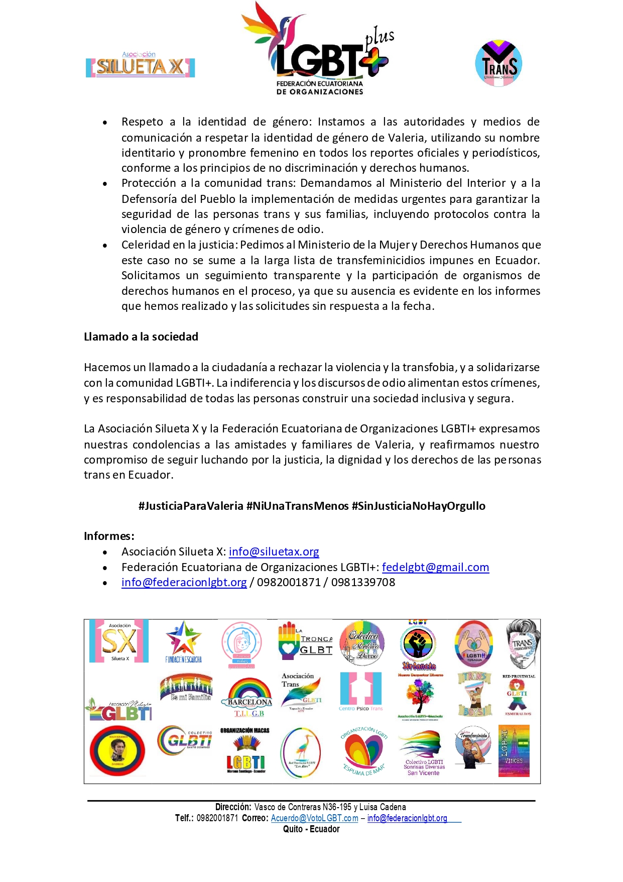 La Asociación Silueta X y la Federación Ecuatoriana de Organizaciones LGBTI+ expresamos nuestras condolencias a las amistades y familiares de Valeria, y reafirmamos nuestro compromiso de seguir luchando por la justicia, la dignidad y los derechos de las personas trans en Ecuador.