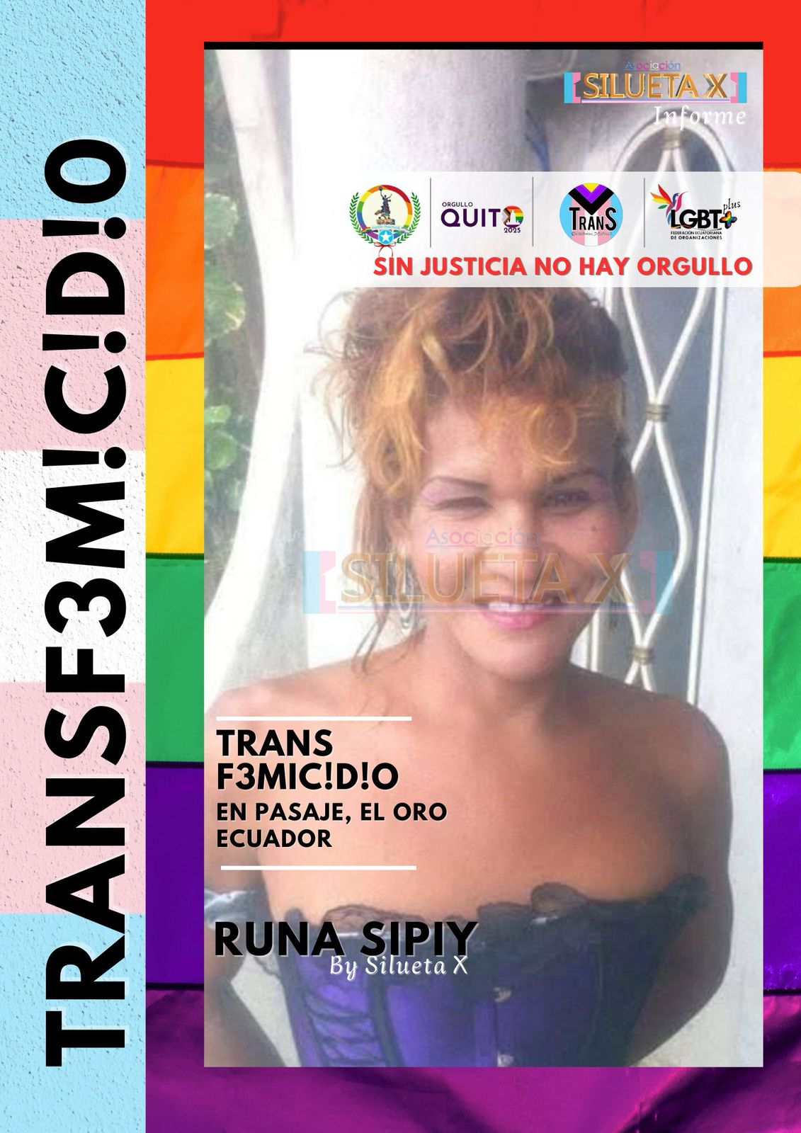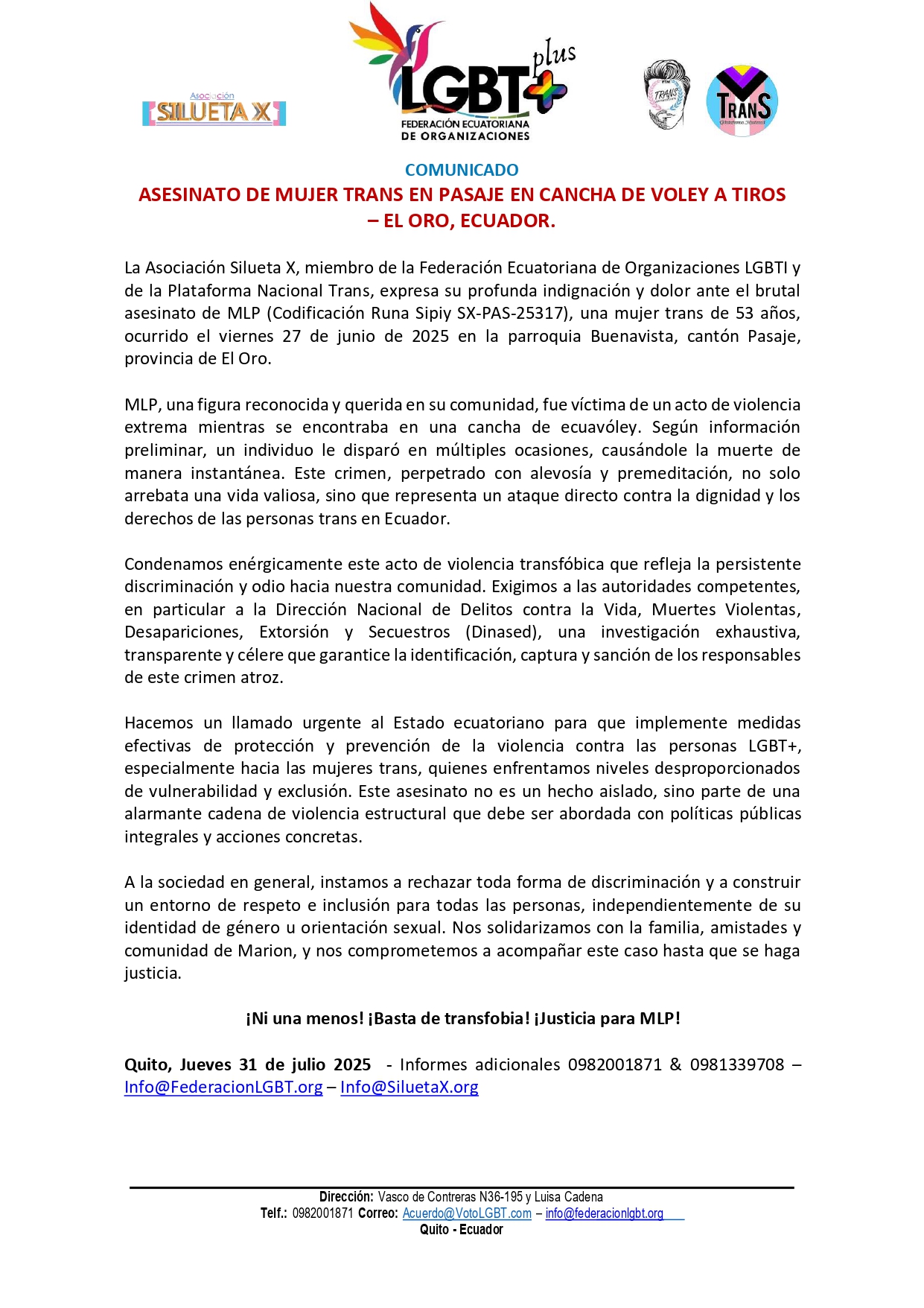 La Asociación Silueta X, miembro de la Federación Ecuatoriana de Organizaciones LGBTI y de la Plataforma Nacional Trans, expresa su profunda indignación y dolor ante el brutal asesinato de MLP (Codificación Runa Sipiy SX-PAS-25317), una mujer trans de 53 años, ocurrido el viernes 27 de junio de 2025 en la parroquia Buenavista, cantón Pasaje, provincia de El Oro.